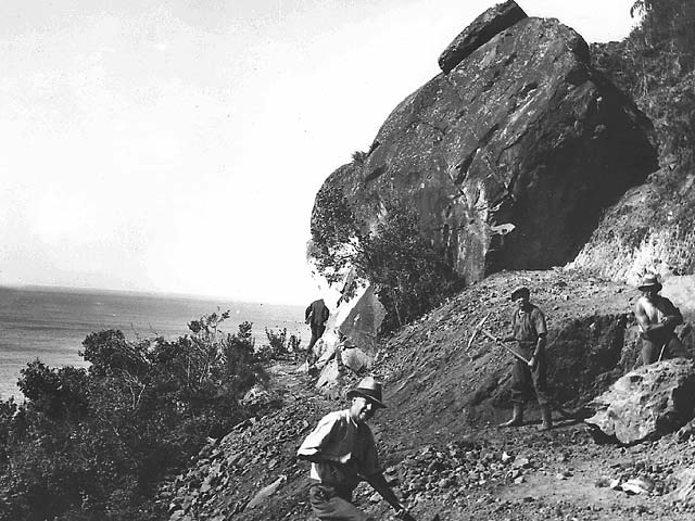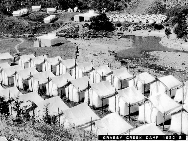 Im August 1918 wurden tausende ehemalige Soldaten gefragt, ob sie bereit wären, an diesem Projekt mitzuwirken. Und nach erfolgter Vermessung begann ein Bauvorhaben von ungeahnter Dimension. Vor allem wegen der fast unüberwindbaren geologischen Voraussetzungen. Wer sich das obige Bild anschaut wird verstehen, warum Schaufel und Hacke die einzigen möglichen Arbeitsgeräte waren. Was für eine zermürbende Aufgabe! Wenigstens konnten Felsen gesprengt werden. Auf kleinen Karren, von Pferden gezogen, wurde das Gestein abtransportiert. 3000 ehemalige Militärangehörige begannen mit dem Bau der Strasse. Sie waren in Zeltlagern im Busch untergebracht. Das erste Camp lag nahe St. Georges River. Doch den schweren Arbeits- und Lebensbedingungen war nicht jeder gewachsen. Die Meinungen der Digger zwischen „der Akzeptanz für Victoria und den gefallenen Kameraden etwas zu tun“ oder „das war es ja an der Front leichter“ waren auch, neben den Kontroversen mit der Bauleitung über den Fortschritt der Arbeiten, der Grund für eine relativ hohe Fluktuation.