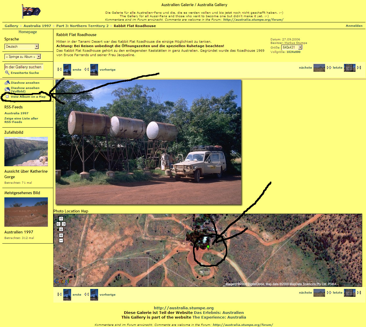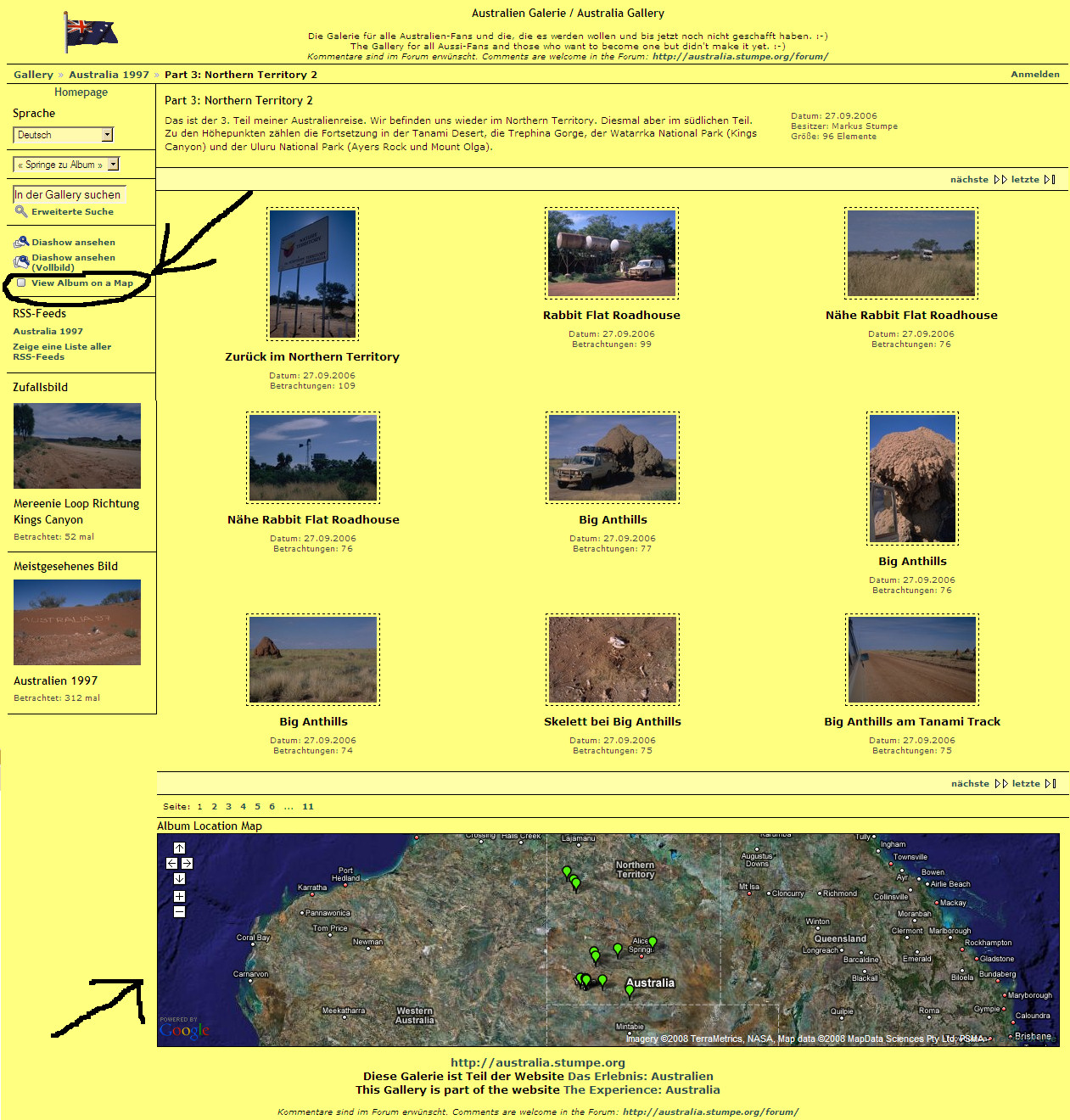 Neben dem Link am oberen Pfeil "View Album on a Map" zum Aufruf der Kartenansicht des aktuellen Albums ist die Darstellung am unteren Pfeil nun ganz neu. Bei der Betrachtung eines Fotos, wird am unteren Bildrand ein breiter Kartenausschnitt gezeigt. Diese Karte zeigt in Form einer kleinen Lampe die Positionen des gerade angezeigten Fotos.