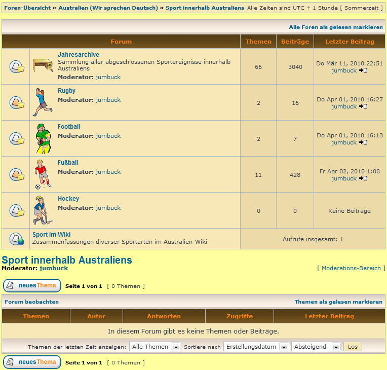 aus Gründen der Übersichtlichkeit, wurde der Sportbereich in Sport innerhalb Australiens für die Sportarten Rugby, Football, Fußball und Hockey in Unterforen aufgeteilt. Die jeweiligen Tabellen sind auch nun in den entsprechenden Unterforen der einzelnen Sportart zu finden.