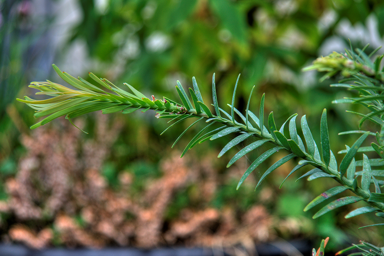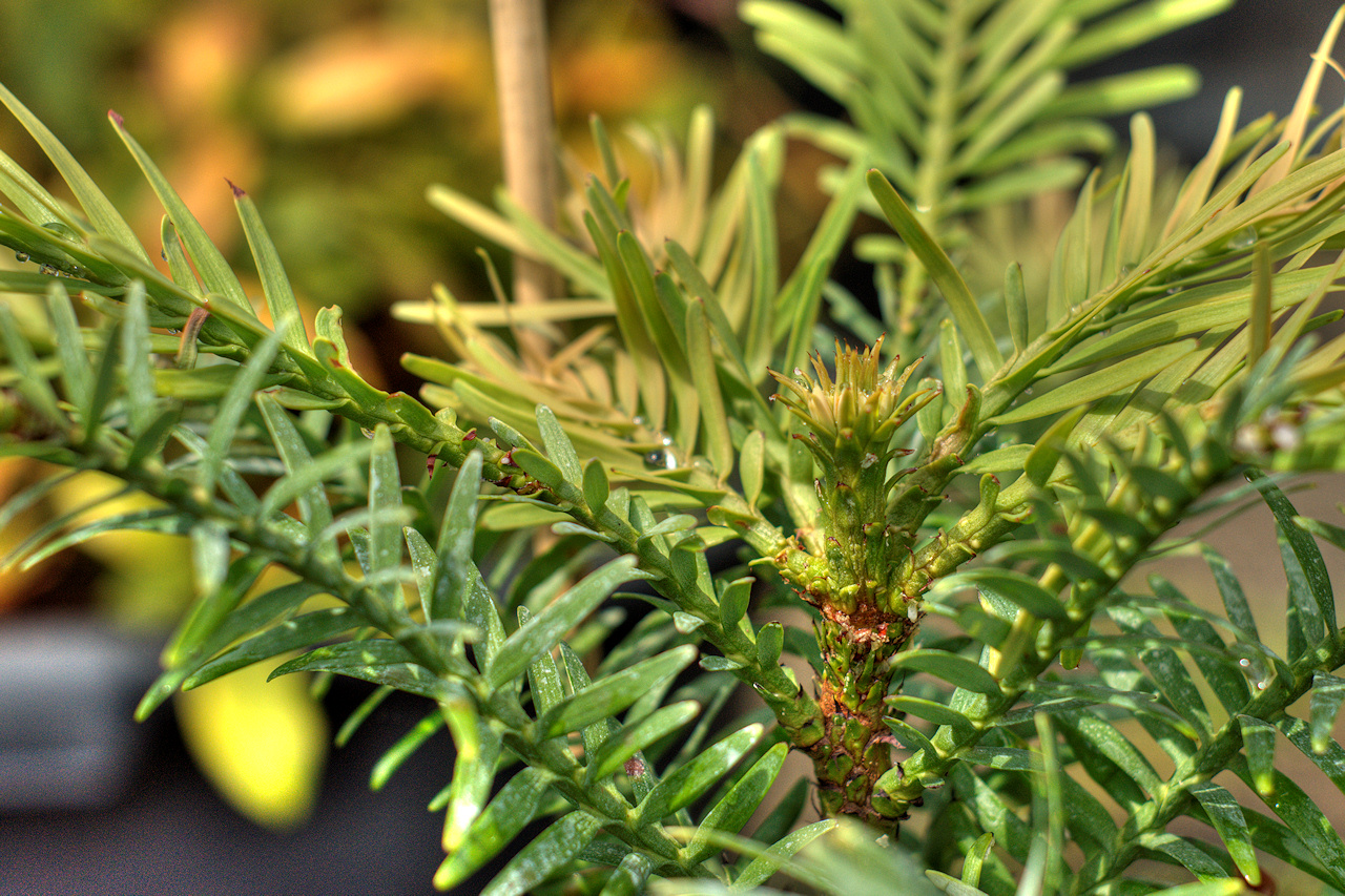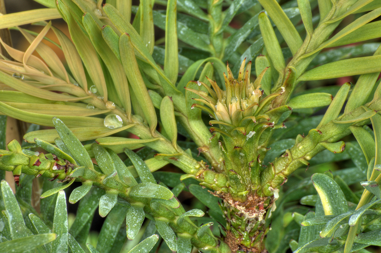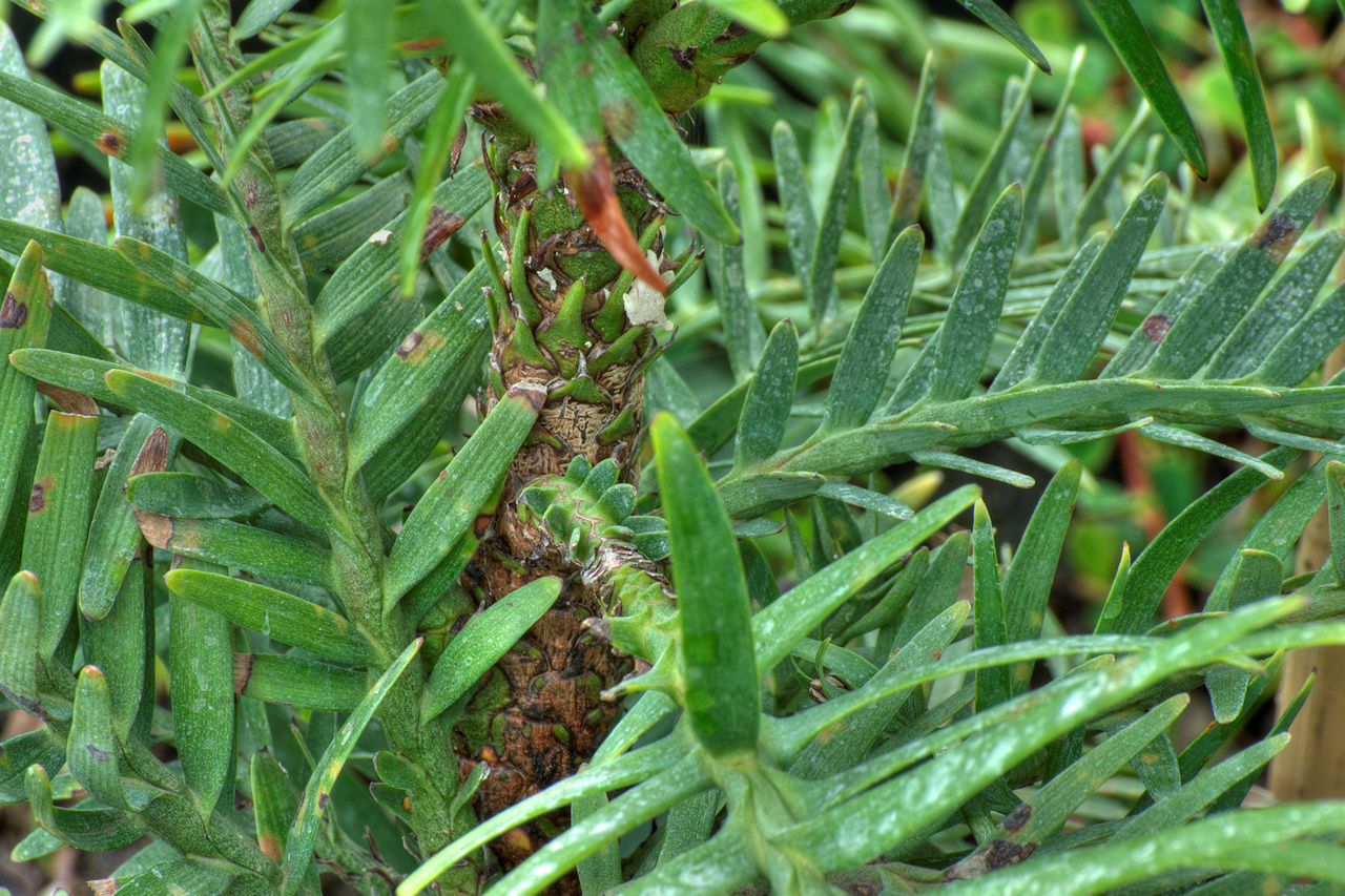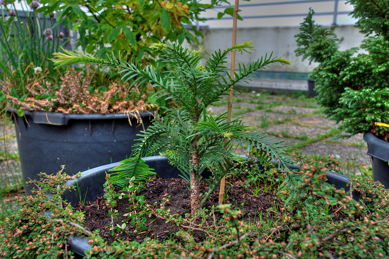 Es handelt sich um eine sog. Wollemie - ein Nadelgehölz - aus den Blue Mountains in Australien. Die Familie dieser Art galt lange Zeit als ausgestorben und wurde Mitte der 1990er Jahre entdeckt. Nun darf ein kleiner Ableger dieser bedrohten Pflanzenart als lebendes Fossil meinen Garten schmücken.