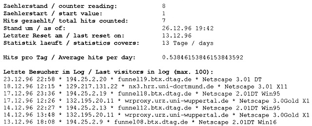 Der Zähler zählte am 26.12.1996 ganze 8 (=acht) Zugriffe.