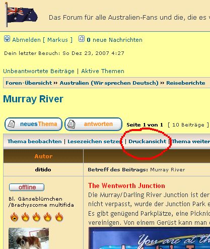 Jeder kennt das Problem, eine Seite im Forum soll ausgedruckt werden und man ärgert sich über die Ränder und abgeschnittenen Texte. Dies hat nun ein Ende! Die folgende Grafik zeigt in dem rot eingekreisten Bereich die Stelle zum Aufruf der sog. Druckansicht.
